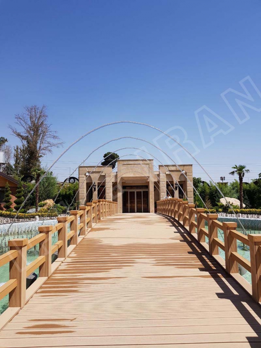 آبنمای موزیکال در وسط محوطه رستوران بقطر 16 متر اجرا شده است که از افکت های متنوع و زیبائی بهره می برد و یک پل چوبی بر روی این آبنما ساخته شده که محل عبور میهمانان از وسط آبنمای موزیکال به سمت سالن پذیرائی می باشد. 15دستگاه نازل لامینار در دو طرف پل تعبیه شده است که ستونی از آب را به دو طرف پل هدایت می کنند و تونلی از آب را بوجود می آورند . دو طرف پل به سیستم مه پاش و تجهیزات نورپردازی رنگی تجهیز شده که زیبائی منحصر بفردی را بوجود می آورد. تمامی آلاچیق ها به سیستم مه پاش و تجهیزات نورپردازی مجهز شده اند که ضمن زیبائی خاصی که به نما و محدوده آلاچیق ها می دهد باعث طراوت و شادابی فضای سبز رستوران نیز می گردند. مابین آلاچیق ها ، رودخانه های جاری وجود دارد که فواره هائی در آن تعبیه شده است تا فضای مابین آلاچیق ها دو چندان زیبا گردد و میهمانان ضمن گذراندن اوقات خوش از صدای آب نیز لذت ببرند.